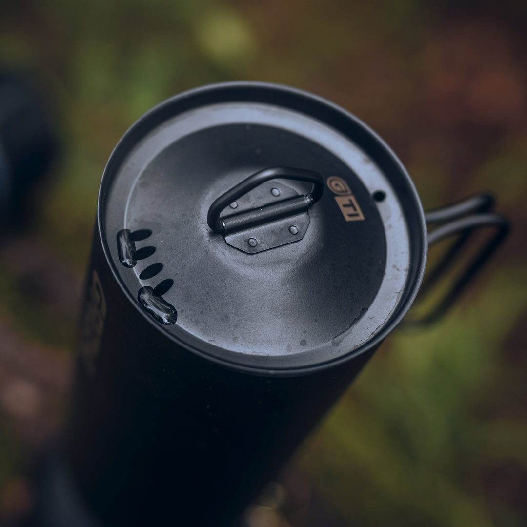 GeoPress Titanium "Black Edition" plus Cook Lid bundled with a black Mission Bottle Sling on a white background