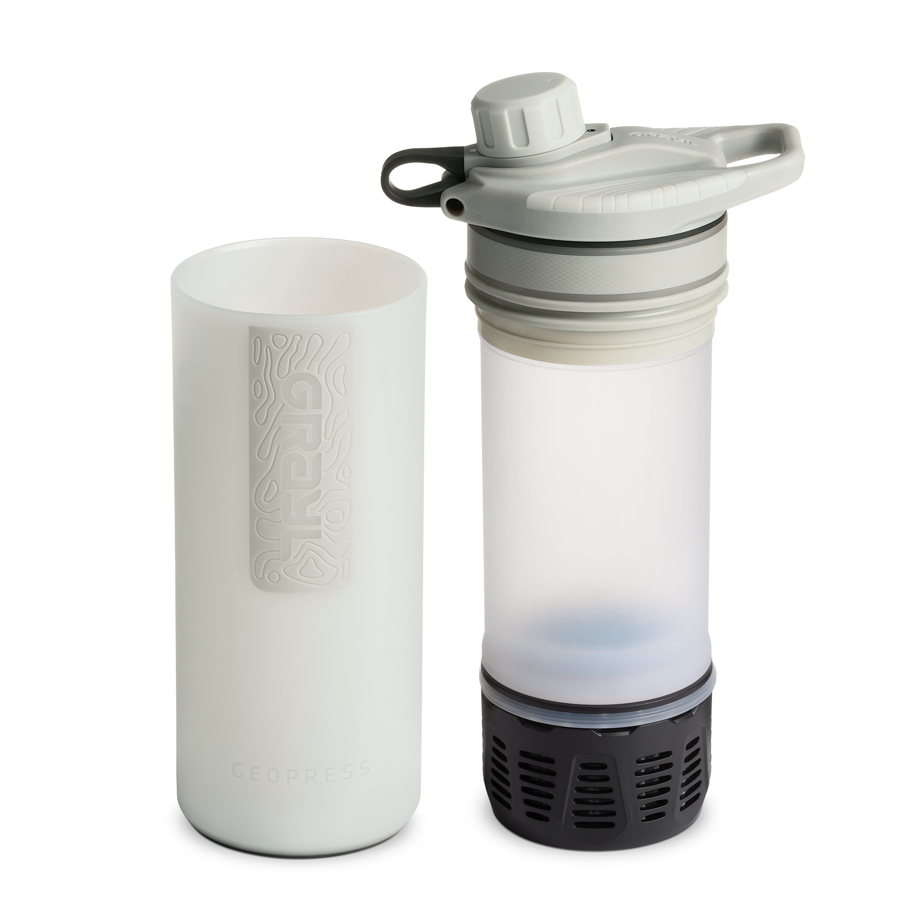 GeoPress® filters and purifies 24 oz of water, ideal for individuals and groups looking for a high capacity. UltraPress® purifies 16.9 oz and is great for individuals with limited space or when traveling with small pack side pockets.