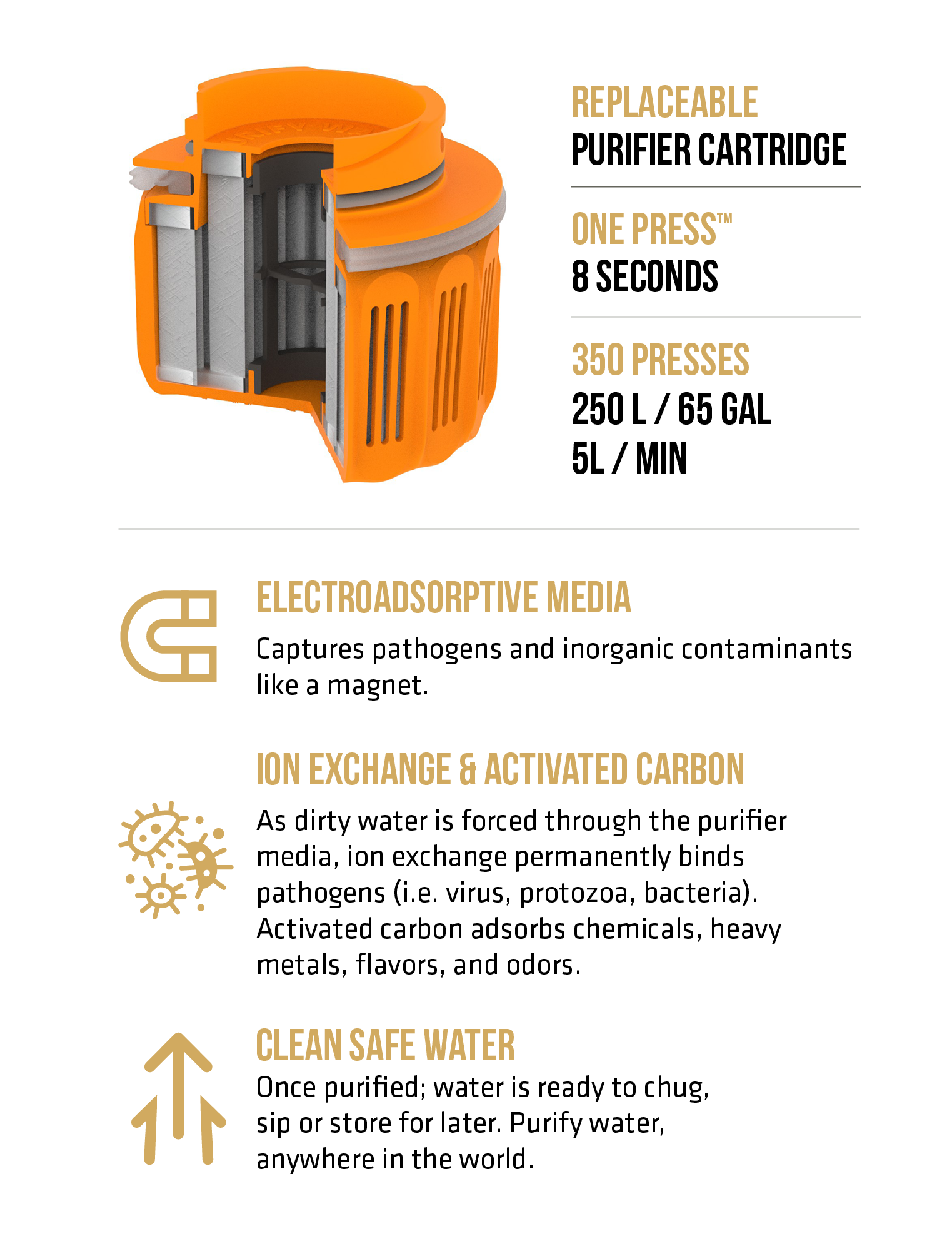 Your water is now free of virus and bacteria and completely safe to drink. You can also use your Grayl multiple times and fill up pitchers or containers for storage.